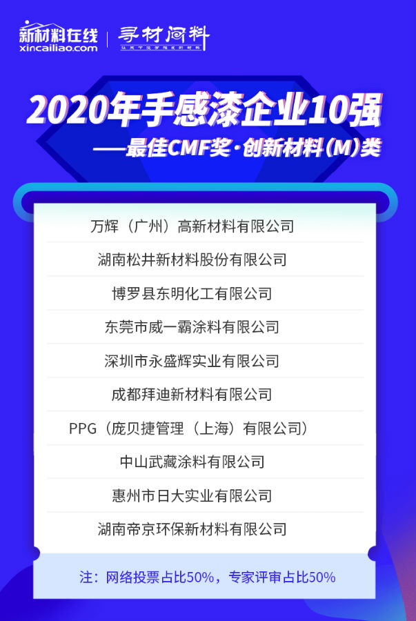 近期,知名傳媒“尋材問料?”表示收到很多終端品牌關于手感漆方案的咨詢,基于此背景,尋材問料?特發起“2020年手感漆企業10強”評選活動,助力終端尋求優質的供應商資源。尋材問料組委會根據企業的主營產品和綜合實力,聯名推薦約20家知名涂料企業進入投票名單,將最終得出前十強名單。前十名排名先后順序將根據網絡投票占比50%及專家評審占比50%票數總和由大到小所得。