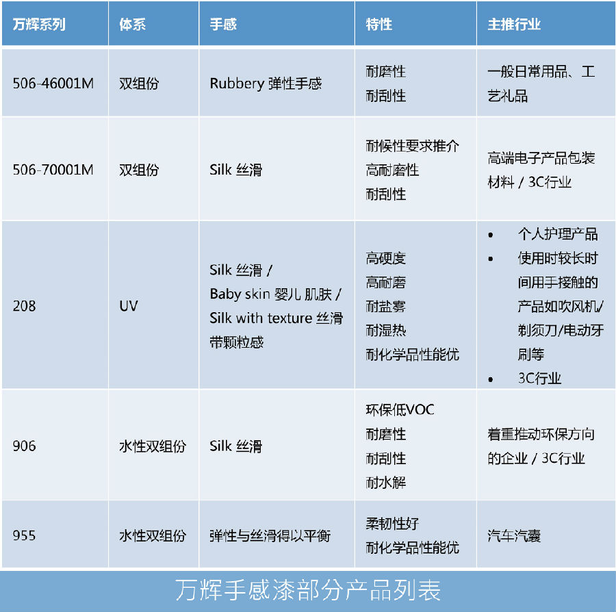 萬輝的手感漆,施工性穩定,并根據客戶不同需求研發出了多種量身訂制種類,如配合環保方面可以符合玩具產品需求、普通平價產品的需求、具有一定抗回粘性及耐磨性需求、綜合性能優異的需求等;同時在手感觸摸體驗上也做出了不同的體驗效果,如手感爽滑觸感、高彈性觸感、嬰兒般皮膚爽滑觸感等;在視覺上,手感漆本為透明無色,萬輝產品手感漆可配合客戶需求噴涂一個有色底漆以提高視覺效果;在技術上,萬輝技術研發人員仍在不斷研發測試及創新,目前已有2kPU、WB2kPU、UV等產品體系,適應客戶不同的環境施工需求。
