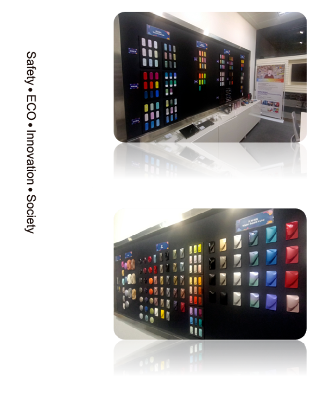 展廳整體以功能化、色彩化為設計理念,通過對市場需求和流行趨勢的精準把握,梳理并設計了以玩具涂料、3C涂料、汽車內外飾涂料和家電涂料等四大產品系列為展示主題。