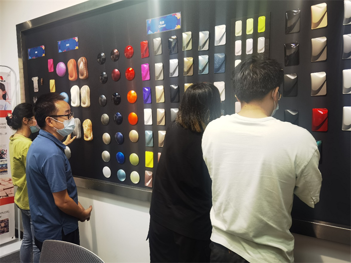 康佳電子CMF團隊深入了解萬輝的烤漆、PU漆、UV漆、單組份、特殊效果涂料等產品及特色,通過實地參觀了萬輝的樣板中心,對萬輝涂料展現的工藝效果及顏色表示高度認可,更是初步為康佳工業中心選擇了萬輝多個樣板顏色作為設計參考,為日后雙方合作奠定了重要基礎。