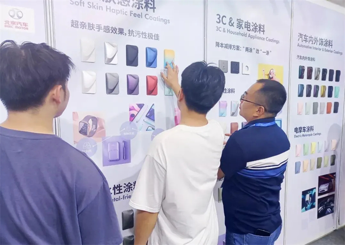 萬輝集團以“納米膚感涂料”、“汽車內外飾涂料”、“3C&家電涂料”、“電摩車涂料”、“特殊效果涂料”5大主題進行產品展示。其中,萬輝兩大創新產品:納米膚感涂料、汽車輕質化碳纖維基材的高效涂裝吸引了展會客戶的重點關注及初步的合作意向。
